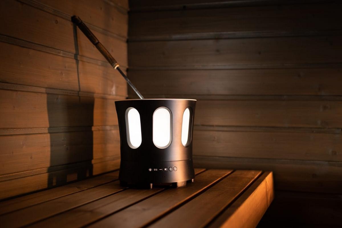 Kyseessä on siis kooltaan suurehko bluetooth-kaiutin, jonka yläosaan on muotoiltu eräänlainen pienehkö saavi. Kaiuttimen korkeus on 28 cm halkaisijaltaan se on noin 27 cm (yläreunasta). Kaiutin vesitiivis (IPX4) ja sen luvataan kestävän hyvin niin kuumaa kuin kylmääkin. Käyttökohteina mainittakoon sauna ja myös juomacooleri. Kaiuttimen yläosassa olevan vesitilan tilavuus on nelisen litraa, joten kovin monia löylyjä siitä ei kyllä heitetä. Coolerina tilavuus riittänee paremmin. Kaiuttimessa on eri värejä sisältävä led-valaistus. Kaiuttimessa on sisäänrakennettu akku, joten saunaan ei onneksi tarvitse vetää jatkojohtoa.
