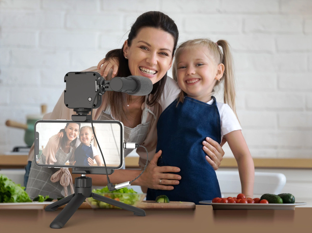 3. Pakettiin kuuluu myös monipuolinen mikrofoni, jossa on 3,5 mm liitin. Mikrofoni on yhteensopiva älypuhelimien kanssa, joissa on 3,5 mm audioliitäntä. Mikäli älypuhelimessa ei ole tällaista liitäntää, tarvitaan erikseen myytävä adapteri. Laadukas mikrofoni varmistaa selkeän äänen tallentamisen vloggauksen aikana.