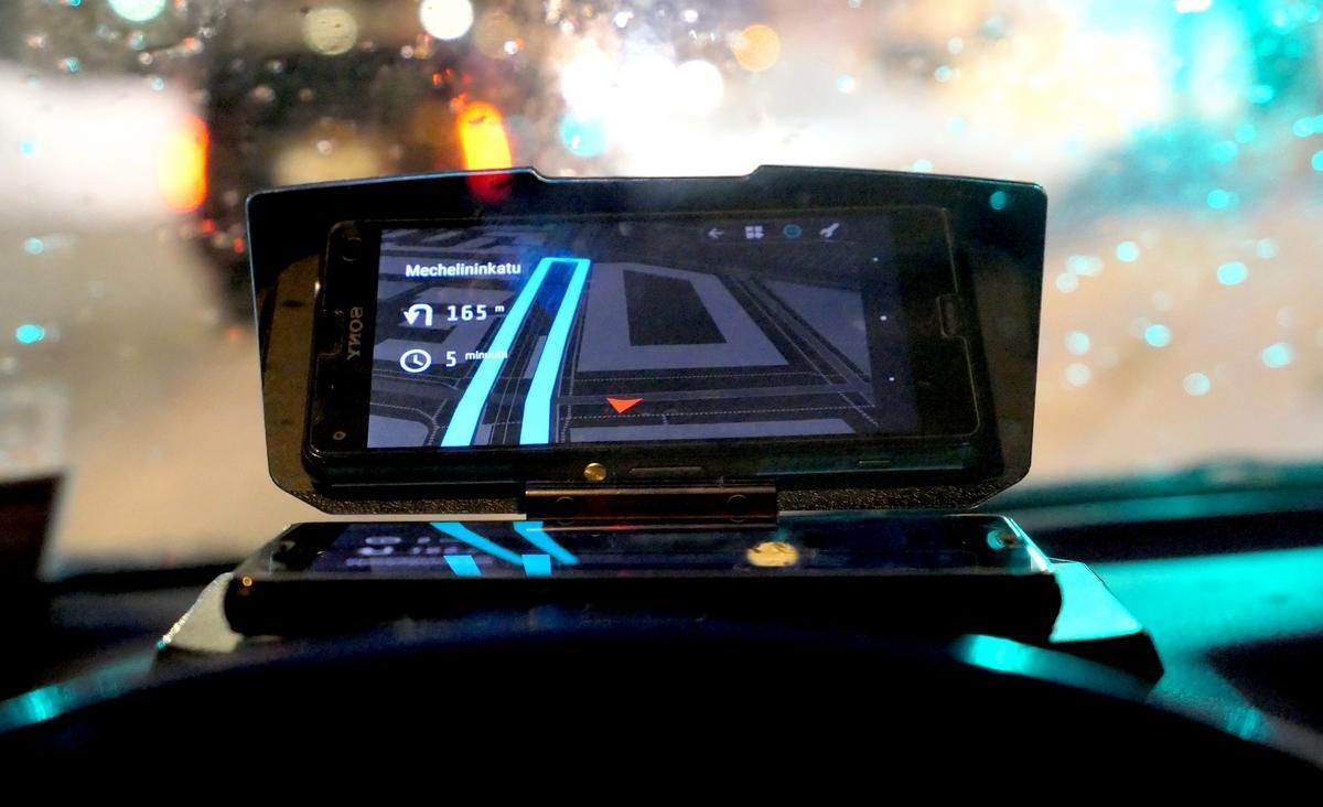 Otimme kokeiltavaksi e-ville verkkokaupasta yksinkertaisen köyhän miehen ”HUD-näytön”, joka heijastaa siihen sijoitetun älypuhelimen näyttökuvan puhelimen yläpuolelle avautuvasta puoliläpäisevästä akryylilevystä.