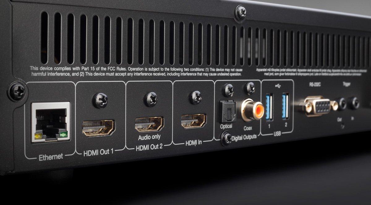 Äänipuolella laite tukee Dolby TrueHD:n DTS-HD Master Audion, DTS:X:n ja Dolby Atmoksen läpimenoa. Häiriöiden välttämiseksi laitteessa ei ole DA-muunninta. Liitäntöinä on spdif- ja koaksiaaliulostulot, yksi hdmi-sisääntulo ja kaksi ulostuloa, kaksi USB 3.0-porttia, ethernet ja RS232C-sarjaportti. Lisäksi laitteessa on integroitu WiFi.