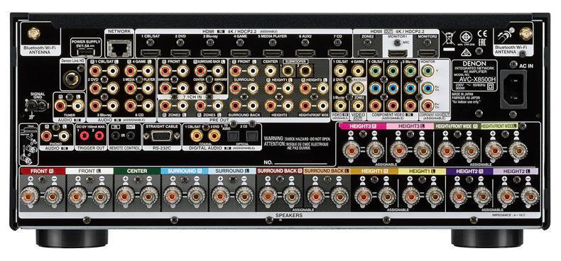 Huomionarvoisinta on, että vahvistin tukee niin Dolby Atmosta, DTS:X:ää kuin Auro 3D:täkin. Vahvistinta voi käyttää myös 9.1.4- tai 7.1.6-kanavaisena, eli Atmos-kaiuttimia voi olla enimmillään peräti kuusi. Luonnollisesti tuki löytyy myös Denonin ja Marantzin HEOS-monihuonejärjestelmälle. Puheohjaus onnistuu Amazon Alexan avulla ja langattomista lähteistä hoituvat bluetooth ja Airplay.