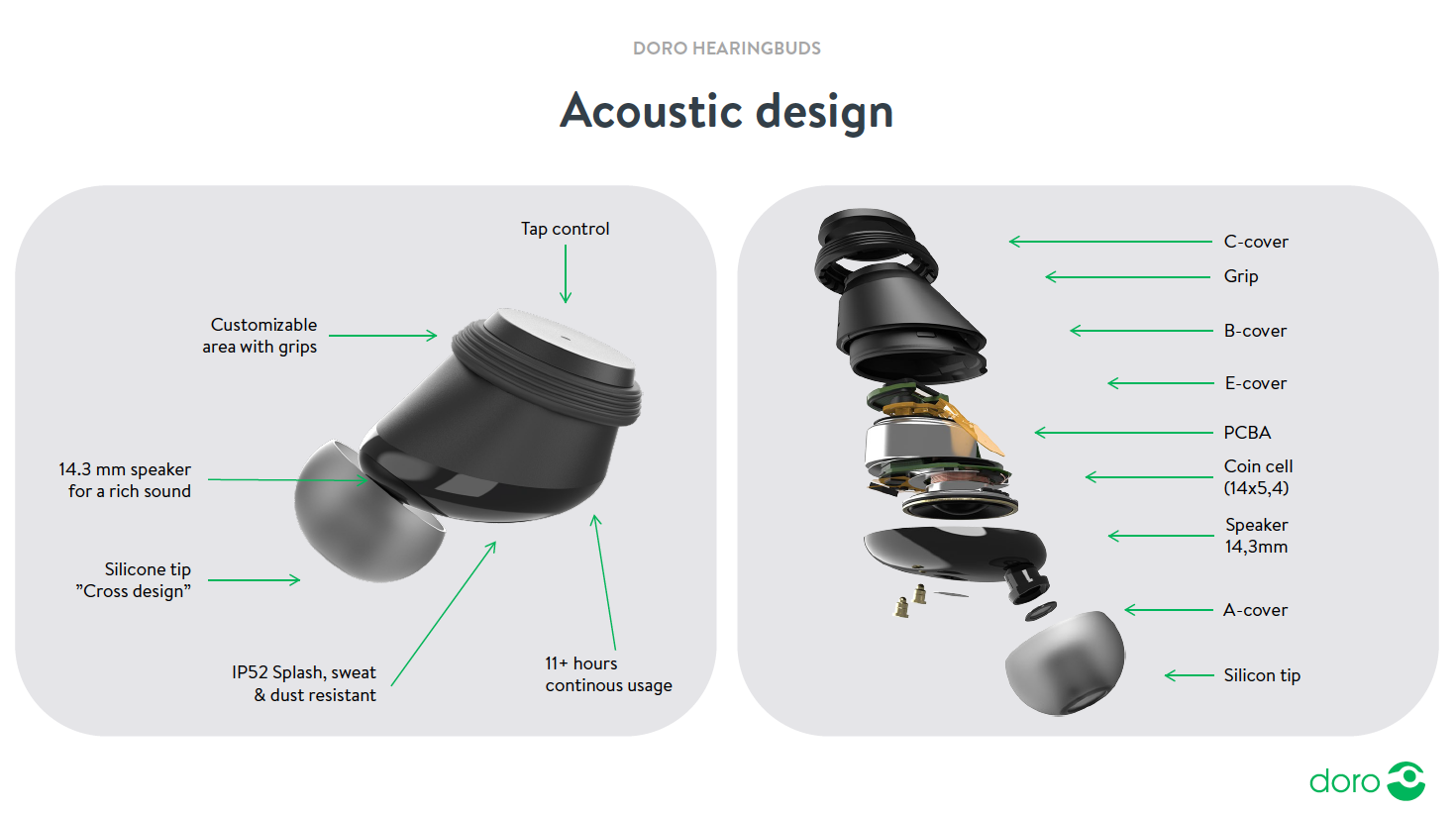 Uudet Doro HearingBuds -kuulokkeet tarjoavat käyttäjilleen kirkkaamman ja luonnollisemman äänikokemuksen. Ne hyödyntävät edistyksellistä ääniteknologiaa, mukaan lukien kuulonparannusalgoritmit, joita tavallisesti käytetään kuulolaitteissa. Kuulokkeiden akustinen muotoilu painottaa äänen luonnollisuutta ja vähentää äänen puuroutumista. Kuulokkeet parantavat keskusteluja vahvistamalla puhetta ja vähentämällä ympäristön häiriöitä.