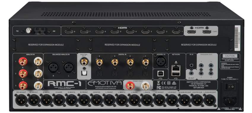 Emotiva on esitellyt lippulaivaluokan 16-kanavaisen RMC-1-prosessorin. Prosessorissa on 16 balansoitua kanavaa. Etuvahvistin on täysin balansoitu. Ad- ja da-muunnos tapahtuu 32-bittisenä. Hdmi-sisääntuloja on kahdeksan ja ulostuloja kaksi. Se tukee ääniformaateista Dolby Atmosta 9.1.6-kanavaisena ja DTS:X:ää 7.1.4-kanavaisena, videopuolelta taas 4k uhd:ta, hdr:ää ja Dolby Visionia.