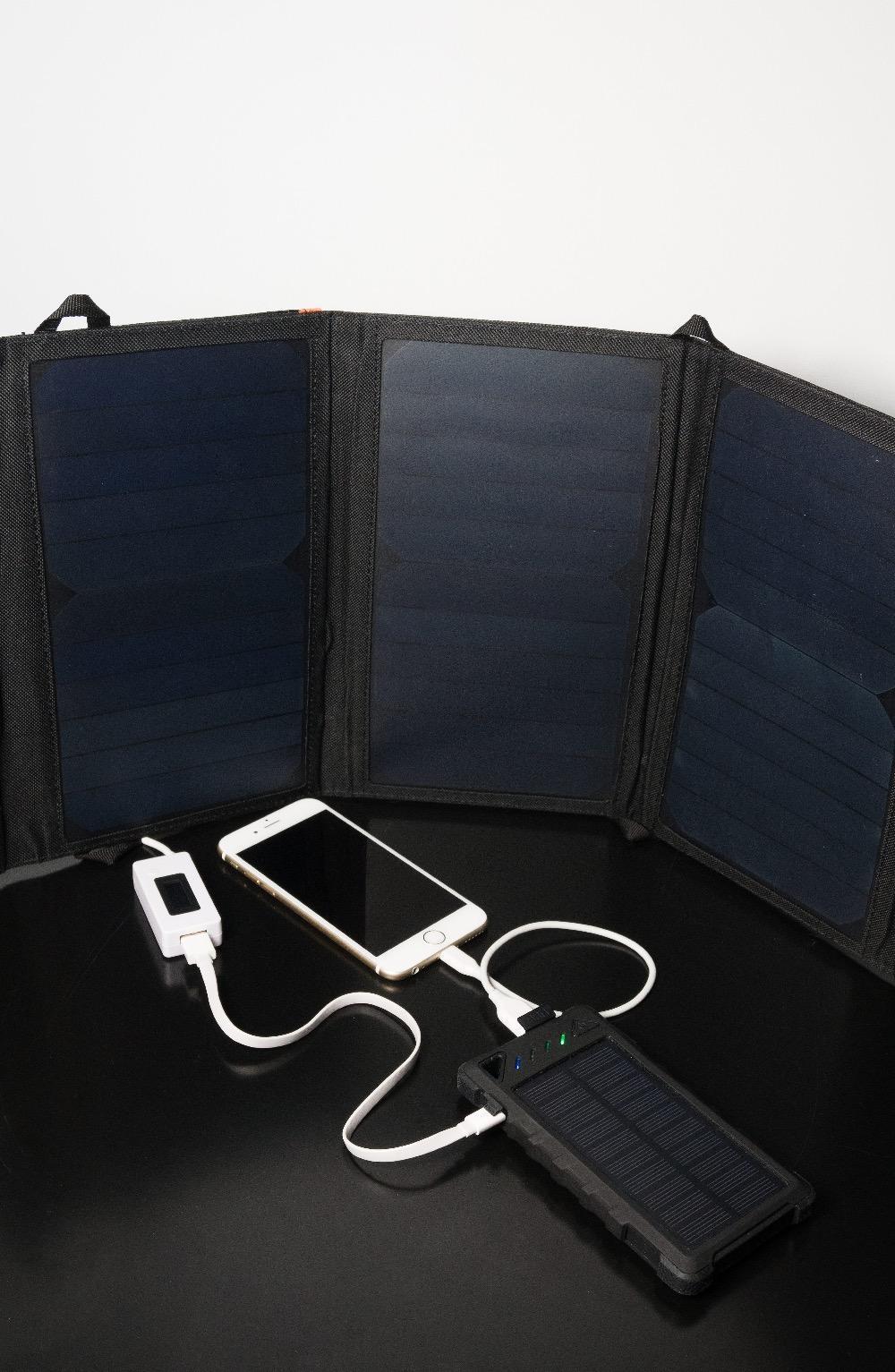 Testasimme 8 000 milliampeeritunnin varavirtalähteen, jossa on ison osan yläpinnasta täyttävä aurinkopaneeli. Virtalähde on silikonireunuksilla tiivistetty, joten se kestänee myös hyvin kosteita olosuhteita. Usb-porttien suojat eivät ole järin tiiviin tuntuisia, joten veteen laitetta ei kannata vesitiiviyslupauksista huolimatta upottaa.