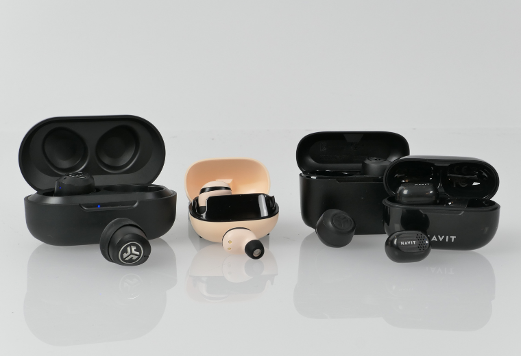 Otimme kokeiltavaksi neljä enemmän tai vähemmän sattumanvaraista halpaa nappikuuloketta: Puuilo-liikkeestä löytämämme vain 15,90 euron hintaiset Havit TW925:t, Power-ketjusta kahdet JLabit, 29 euron Go Air Popit (tarjoushinta 19,90 euroa) ja vain 15 euroa kalliimmat (tarjoushinta 34,90 euroa) JBuds Air ANC:t, joissa siis jo mallimerkinnän mukaisesti on aktiivinen melunvaimennus (ANC). Neljänneksi mukaan valikoitui viime aikoina runsaasti otsikoissa olleesta kiinalaisesta Temu-verkkokaupasta vain reilun kympin maksaneet minikuulokkeet nimellä ”Tech Earphones”, jotka otettiin mukaan nimenomaan niiden erittäin pienen koon vuoksi.