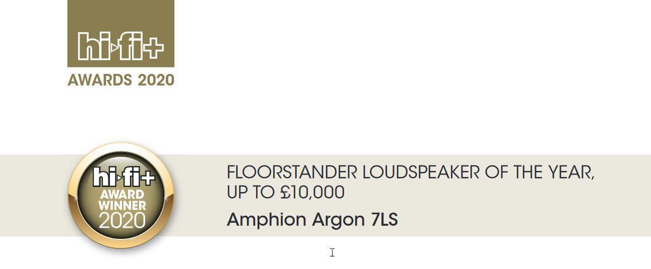 Amphion Argon 7LS on vuoden 2020 lattiakaiutin hintaluokassa alle 10 000 puntaa. Palkinnon myönsi arvostettu brittiläinen puhtaasti laadukkaaseen äänentoistoon keskittyvä Hifi+ lehti.