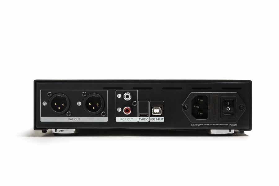 Etupaneelissa on neliasentoinen säätö vahvistustasolle sekä äänenvoimakkuuden säädin. Digisisääntuloina on usb-b ja usb-c. Optista sisääntuloa ei siis ole. Lähtöliitäntöjä taas on sitäkin enemmän: rca, xlr ja kuulokekäyttöön 3,5 mm miniplugi, 6,35 mm iso plugi, 4,4 mm balansoitu ja nelipinninen xlr.