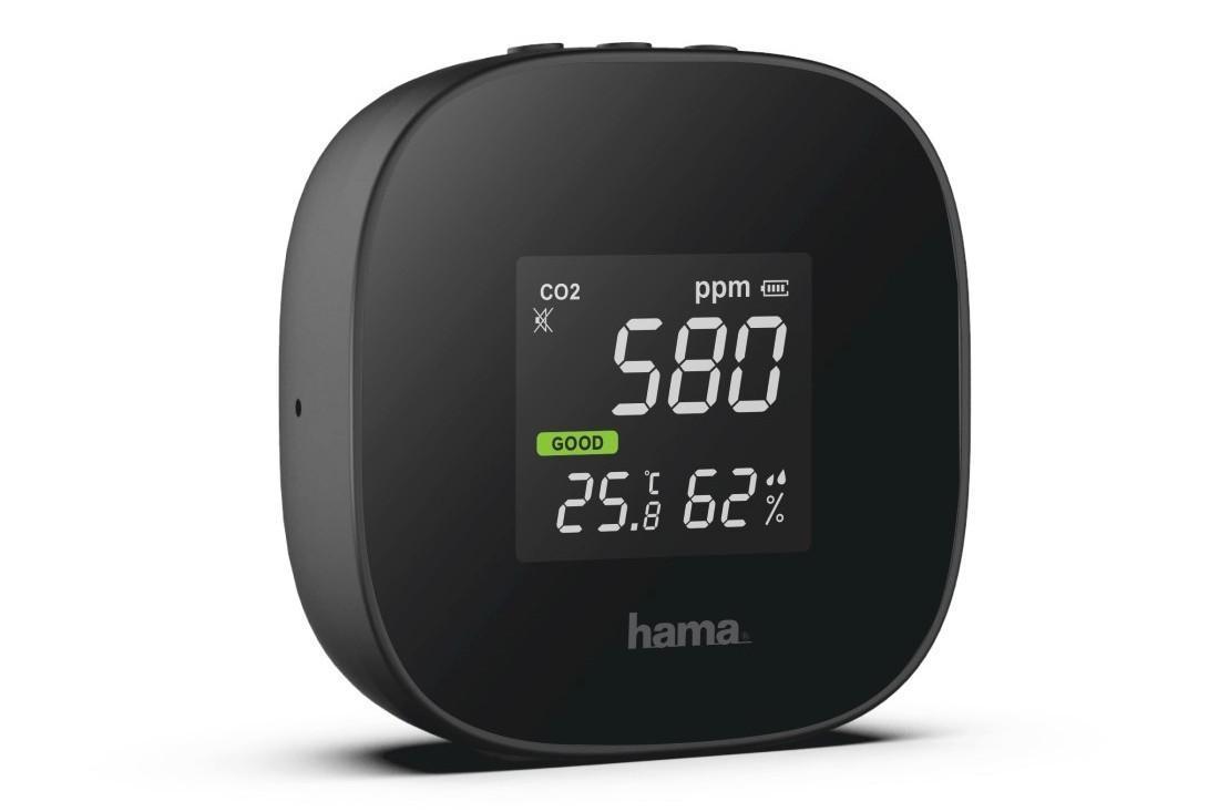 Hama Safe CO2-mittauslaite (00186434) mittaa huoneilman hiilidioksidi pitoisuutta ja ilmaisee sen lukuarvolla (ppm) ja merkkivaloilla (vihreä=hyvä, keltainen=normaali ja punainen =huono). Kun ilmaisin näyttää punaista laite hälyttää ja on aika tuulettaa huone. Laite ilmoittaa myös lämpötilan sekä ilmankosteuden.