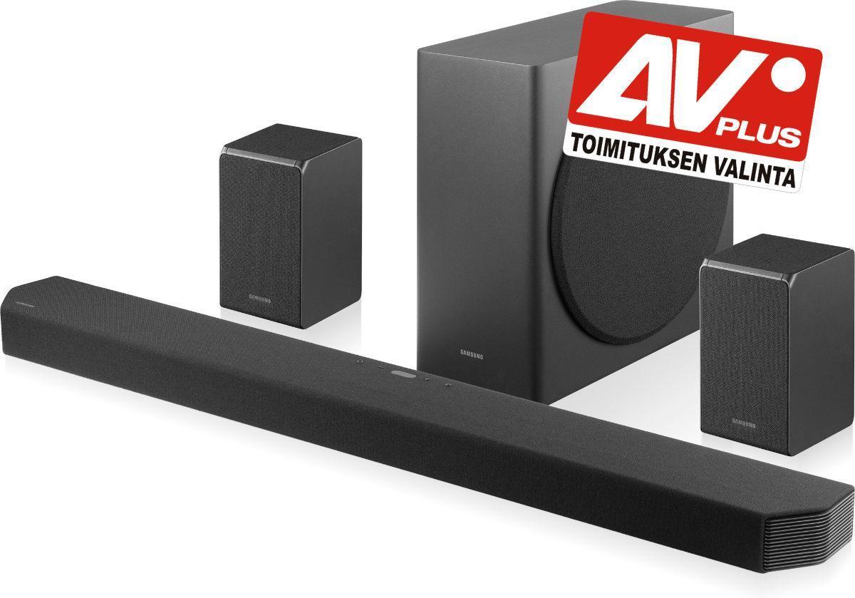 HW-Q960A on eteläkorealaisjätti Samsungin tämänhetkisen soundbar-malliston lippulaiva ja samalla tämänhetkisen soundbar-kentän kanavakunkku 11.1.4-konfiguraatiollaan, joka kattaa esimerkiksi Dolby Atmos- ja DTS:X-äänen vaatimukset. Kanavia toistamassa on yhteensä 22 elementtiä, jotka jakautuvat itse soundbariin (15 elementtiä) sekä langattomiin taka-surround-kaiuttimiin (kuusi elementtiä) ja langattomaan subwooferiin (yksi 8-tuumainen elementti). Koko paketin hinta on 1 500 euroa, mikä on soundbarista melko paljon, mutta kalliimpiakin markkinoilta löytyy, esimerkiksi AVPlus-numerossa 8/21 testattu, 2 099 euroa maksava Klipsch Cinema 1200.