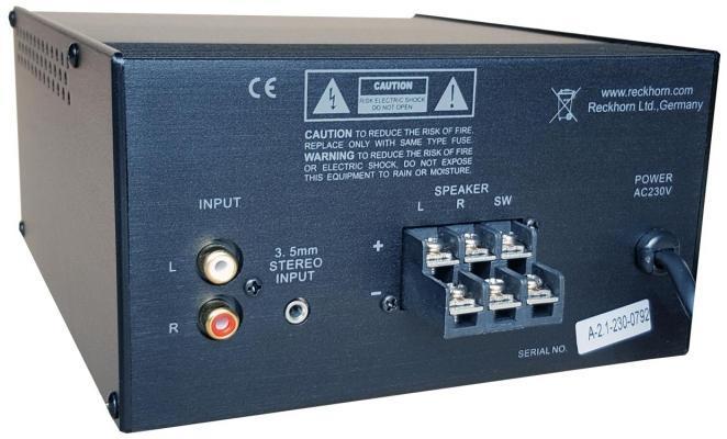 Reckhornin A 2.1 on kompakti kolmikanavainen vahvistin, joka ei vie liikaa tilaa esimerkiksi työpöydältä. Sitä voi siis käyttää esimerkiksi tietokoneen kaverina tai perinteisenä mutta tavallista pienempään sopukkaan sopivana vahvistimena.