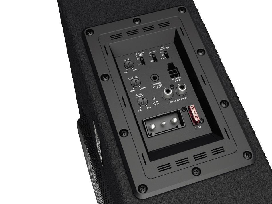 Medialähteen kytkentään on tarjolla sekä kaiutin- että linjatasoinen liitäntä, ja subwooferin toiston voi toki sovittaa myös esimerkiksi mediasoittimesta. Lisäksi mukana on SSP- eli Sub Smart Plug -terminaali, jonka avulla vahvistimen irrotus kontista onnistuu käden käänteessä.