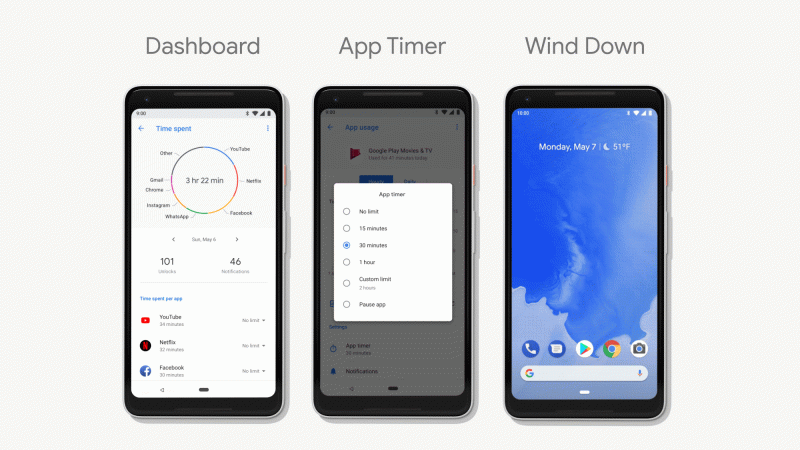 Pie-versioon on tulossa myöhemmin myös digitaalisia hyvinvointiominaisuuksia. Käyttöjärjestelmä esimerkiksi raportoi, montako minuuttia käyttäjä viettää kussakin sovelluksessa, montako ilmoitusta käyttöjärjestelmään tulee ja kuinka usein käyttäjä avaa puhelimen lukituksen. Sovelluksiin voi myös asettaa ajastimia ja hälytyksiä, kun asetettu maksimiaika lähestyy. Käyttöjärjestelmän voi myös asettaa menemään mustavalkotilaan, jolloin se muistuttaa nukkumaan menosta.