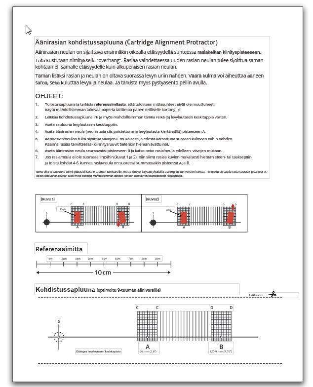 Äänirasian ja sen neulan tulee olla suorassa eli tangentin suuntaisesti äänilevyn uraan nähden. Kääntyvällä äänivarrella on liikeradallaan vain kaksi niin sanottua nollakohtaa, joissa kulma on oikea ja kaikki muut ovat kompromisseja. Äänirasian neulan tulisi olla erityisesti näissä kohdissa suorassa levyn uraan nähden. Tämä on helppo tarkistaa kohdistussapluunalla.
