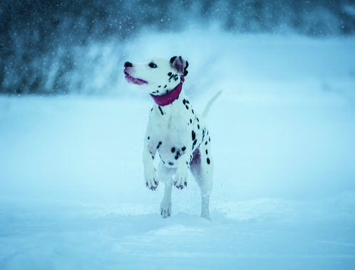 Lumihangessa hyppivän koiran liike on pysähtynyt 1/640 s. valotusajalla.