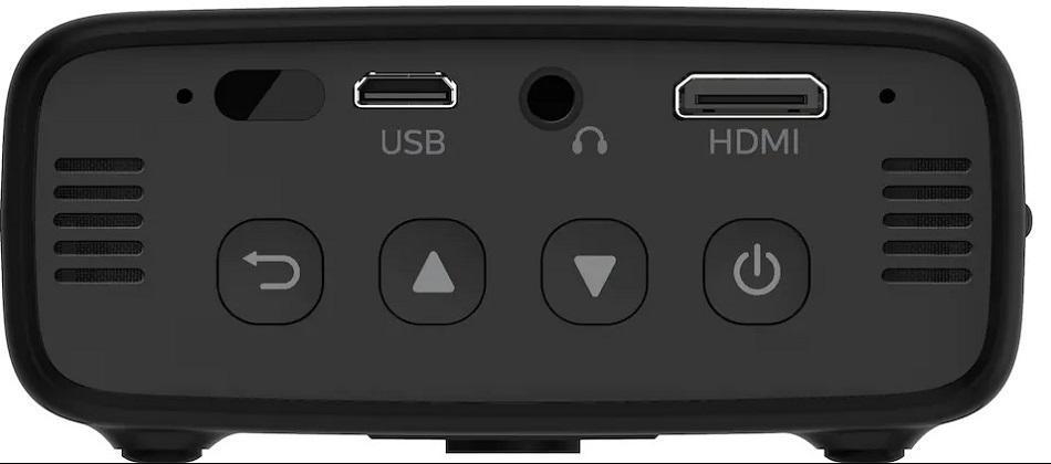 Voit jakaa videoita, kuvia ja äänitiedostoja Mini HDMI -portin kautta. Voit samalla ladata projektorin akkua erillisen USB-kaapelin avulla.
