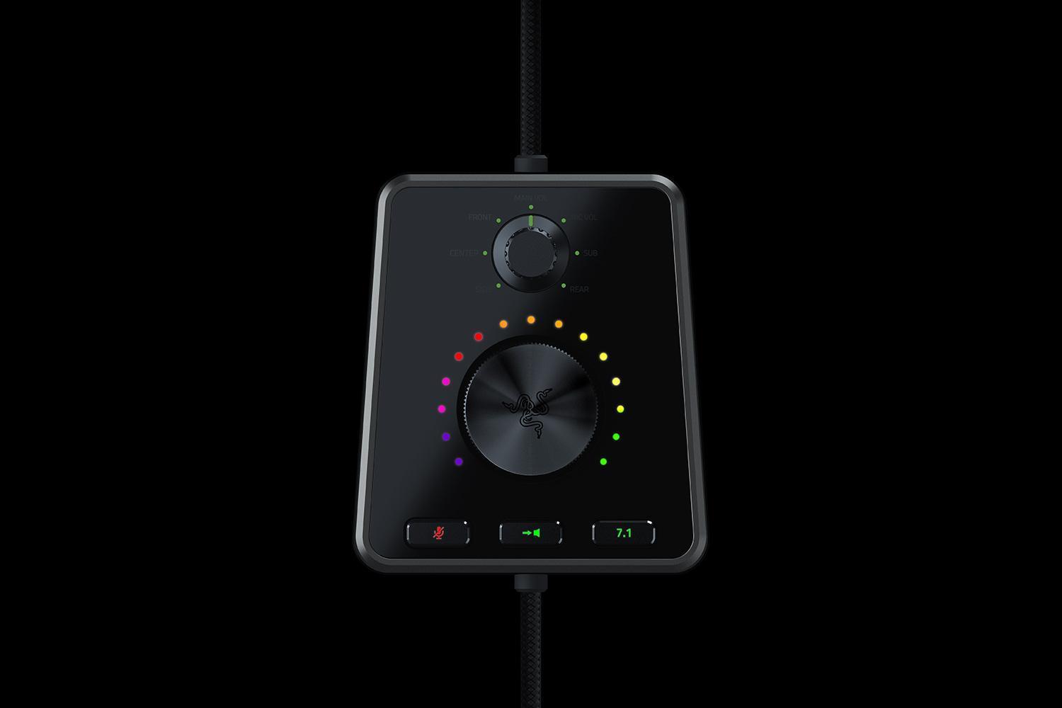 Ohjainyksikön kautta voi säätää jokaisen kanavan äänenvoimakkuutta erikseen, valita 7.1- ja 2.0-kanavaisen tilan välillä, vaimentaa äänen ja mikrofonin sekä valita kuulokkeiden ja kaiuttimien välillä. Kuuloke-elementit on valaistu ja valoja pystyy säätämään Razer Chroma -sovelluksella.