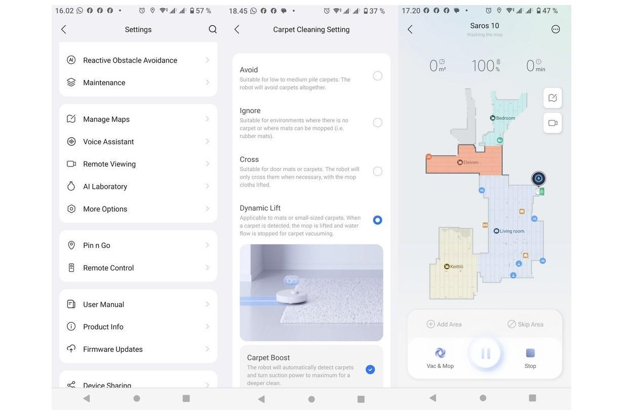 Kun kartta oli “piirretty”, vaikutti homma sujuvan seuraavalla kerralla nopeammin ja järjestelmällisemmin, tosin edelleen kynnykset olivat hieman haastavia. Karttaa voi myös “editoida” manuaalisesti. Rajata/nimetä huoneita ja eri tiloja haluamallaan tavalla, merkitä huonekaluja ja no-go-alueita jne. Jatkossa imurin voi laittaa siivoamaan vain tietyn huoneen tai alueen. Puhdistukselle on lukuisia asetuksia, joiden eroja ei kuitenkaan selitetä kunnolla. Imurin voi myös laittaa tekemään kaksi siivouskertaa peräkkäin ja imuria voi myös ohjata manuaalisesti haluamaansa paikkaan.
