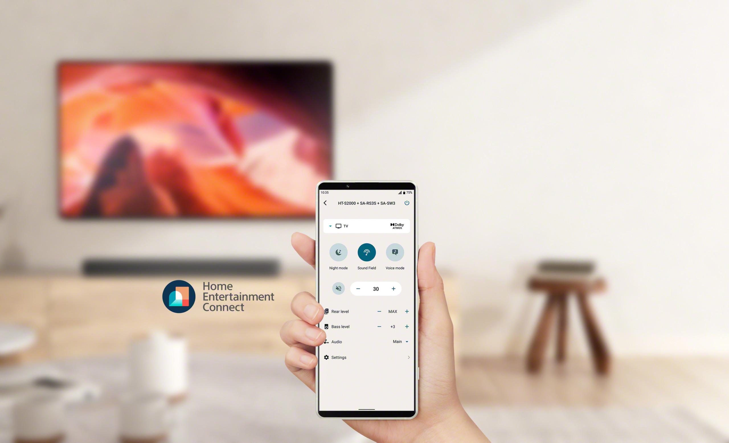 Lisäksi käytössä on uusi Sony Home Entertainment Connect sovellus, jonka avulla soundbarin voi paitsi määrittää, myös säätää ja mukauttaa monipuolisesti. Ohjelmistopäivitysten kautta laitteeseen tulee uusia ominaisuuksia tulevaisuudessa.