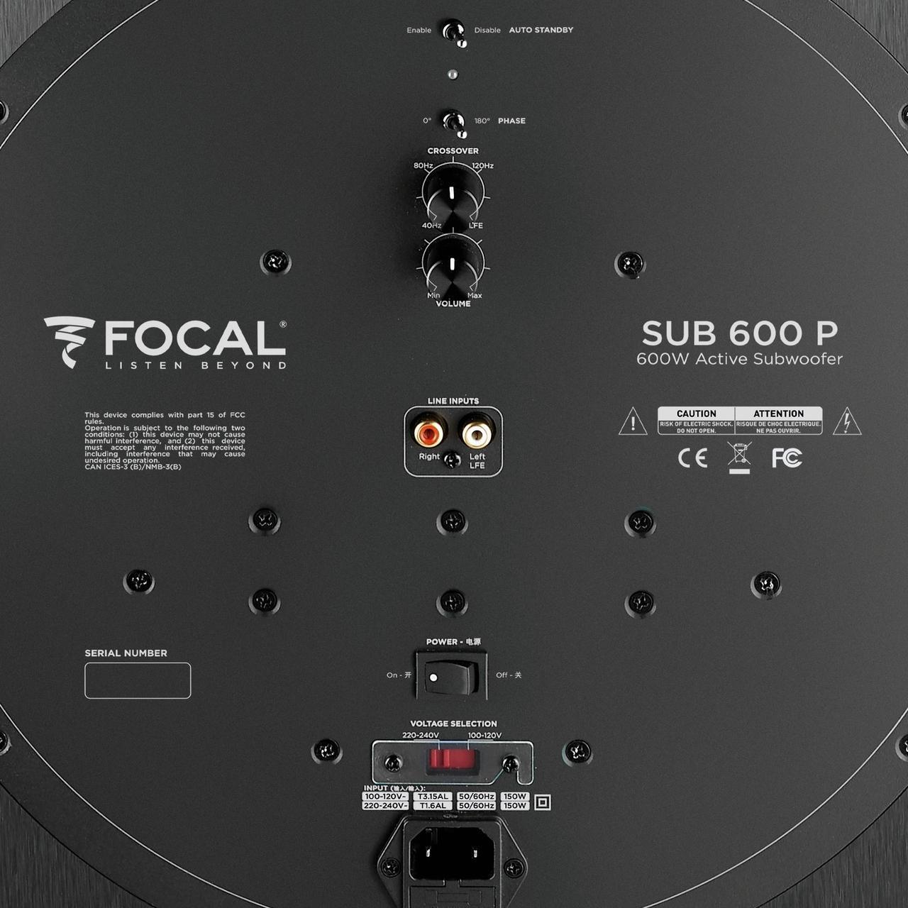 Niin hifi- kuin kotiteatterikäyttöönkin soveltuva, 899 euroa maksava Focal Sub 600P on melko maltillisen kokoinen (40 x 40 x 42,5 senttimetriä), 21-kiloinen, rakenteeltaan suljettu aktiivisubwoofer 12-tuumaisella elementillä, jossa on Polyflex-kartio. D-luokassa toimivan vahvistimen tehoksi Focal ilmoittaa 600 wattia. Taajuusvasteeksi taas kerrotaan 28–270 hertsiä (±3 dB).