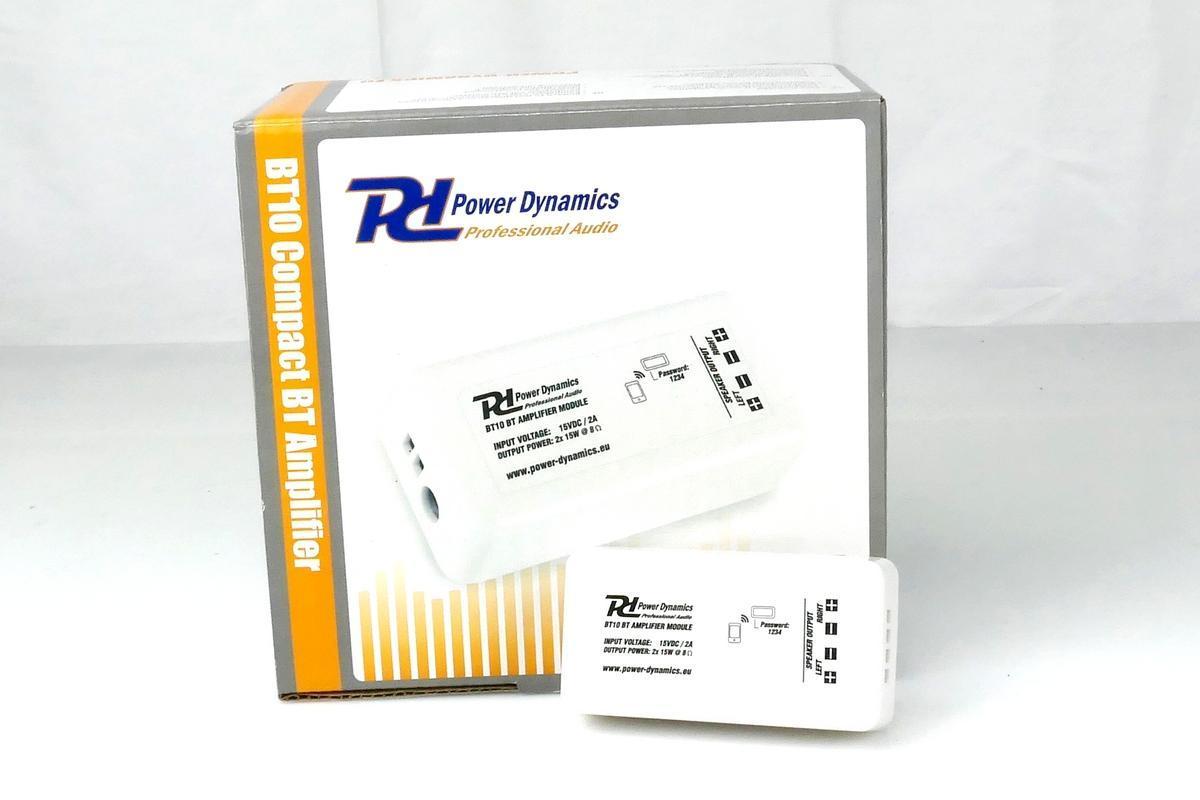 Power Dynamics BT10 on vain 30 euroa maksava, hieman led-valaisimien virtalähteen näköinen, pienikokoinen muovikotelo, joka sisältää d-luokan vahvistimen bluetooth-vastaanottimella. Kotelon toisessa päässä on virtaliitännät 15 voltin muuntajalle, joka kuuluu toimitukseen, tai suoraan irtojohdoille (huom. 15V) ja toisessa päässä kaiutinlähdöt ruuviterminaaleilla.