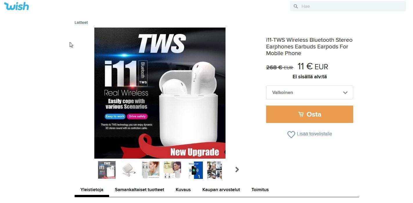 Otimme ”mukaan” vertailuun Wish-nettikaupassa myytävän noin 11 euron hintaiset Apple AirPodsien kiinalaiskopiot i11 TWS:t.