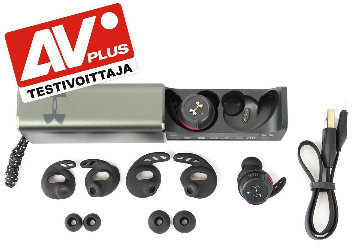 Vertailun toinen JBL-malli on valmistajan Under Armour -sarjaa, joka takaa sopivuuden urheiluun sen lähestulkoon kaikissa ilmenemismuodoissa. True Wireless Flash -kuulokkeiden ja latauskotelon toteutus on poikkeuksellisen raskas ja tukeva, mikä nostaa vakuuttavuusindeksiä heti useammallakin pykälällä. Kuulokkeiden karusta ulkonäöstä huolimatta ne istuvat korviin yllättävän hyvin, ja niiden äänentoisto on Free-mallin tavoin tasapainoista, mukaansatempaavaa ja miellyttävää.
