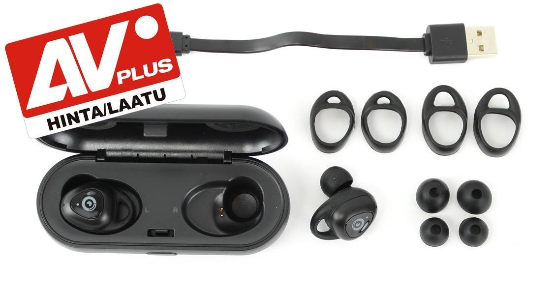 Toinen vertailun edullisimman sarjan edustaja, Procaster, on jo oikeastaan aika käyttökelpoinen kuulokepari kategoriassaan. TW-09 on yksinkertainen, kaikista ylimääräisistä toiminnoista ja ominaisuuksista riisuttu täyslangaton kuuloke, joka toimii tasaisen varmasti uudemmalla bluetooth 5.0-yhteydellä.