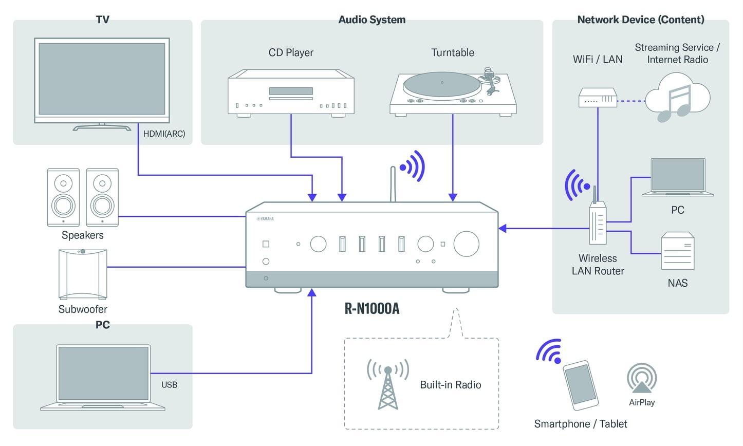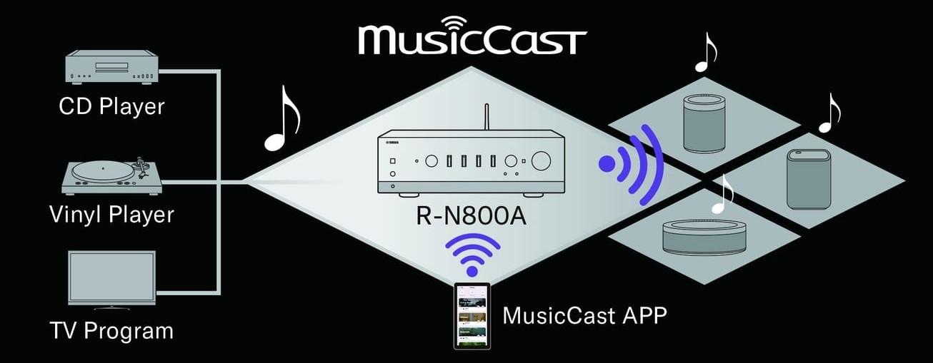MP3-, WMA-, MPEG4-, AAC-, WAV-, FLAC-, AIFF-, ALAC- ja DSD-muodot tuotetaan Yamaha R-N1000A:n ja R-N800A:n kanssa. Yhteys myös Bluetooth 4.2:n ja AirPlay2:n kautta älypuhelimesta, tabletista tai kannettavasta tietokoneesta on mahdollinen.